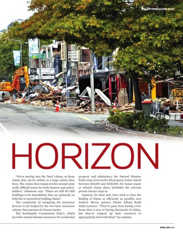HORIZON “We’re moving into the ‘hard’ claims, as those claims that can be settled, to a large extent, have been. The claims that remain revolve around some really difficult issues for both insurers and policyholders,” Johnstone says. “There are still 50 CBD buildings to be demolished; they are primarily on hold due to unresolved building claims.” The complexity of navigating the insurance process is not helped by the two-layer insurance scheme that operates for house repairs. The Earthquake Commission (EQC), which provides natural disaster insurance for residential