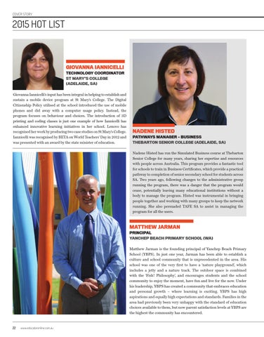 GIOVANNA IANNICELLI TECHNOLOGY COORDINATOR ST MARY’S COLLEGE (ADELAIDE, SA) Giovanna Iannicelli’s input has been integral in helping to establish and sustain a mobile device program at St Mary’s College. The Digital Citizenship Policy utilised at the school introduced the use of mobile phones and did away with a computer usage policy. Instead, the program focuses on behaviour and choices. The introduction of 3D printing and coding classes is just one example of how Iannicelli has enhanced innovative learning initiatives in her school. Lenovo has recognised her work by producing two case studies on St Mary’s College. Iannicelli was recognised by BETA on World Teachers’ Day in 2012 and was presented with an award by the state minister of education.