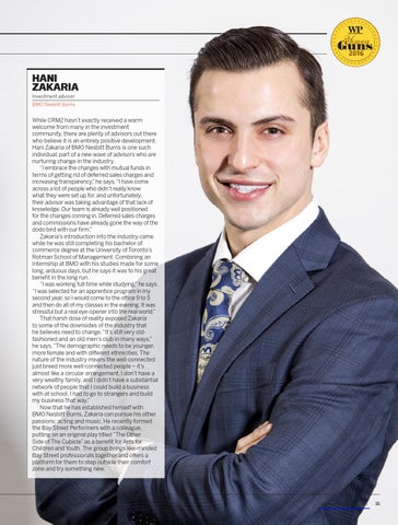 While CRM2 hasn’t exactly received a warm welcome from many in the investment community, there are plenty of advisors out there who believe it is an entirely positive development. Hani Zakaria of BMO Nesbitt Burns is one such individual, part of a new wave of advisors who are nurturing change in the industry. “I embrace the changes with mutual funds in terms of getting rid of deferred sales charges and increasing transparency,” he says. “I have come across a lot of people who didn’t really know what they were set up for, and unfortunately, their advisor was taking advantage of that lack of knowledge. Our team is already well positioned for the changes coming in. Deferred sales charges and commissions have already gone the way of the dodo bird with our firm.” Zakaria’s introduction into the industry came while he was still completing his bachelor of commerce degree at the University of Toronto’s Rotman School of Management. Combining an internship at BMO with his studies made for some long, arduous days, but he says it was to his great benefit in the long run. “I was working full-time while studying,” he says. “I was selected for an apprentice program in my second year, so I would come to the office 9 to 5 and then do all of my classes in the evening. It was stressful but a real eye-opener into the real world.” That harsh dose of reality exposed Zakaria¬¬¬¬¬¬¬¬¬ to some of the downsides of the industry that he believes need to change. “It’s still very oldfashioned and an old men’s club in many ways,” he says. “The demographic needs to be younger, more female and with different ethnicities. The nature of the industry means the well-connected just breed more well-connected people – it’s almost like a circular arrangement. I don’t have a very wealthy family, and I didn’t have a substantial network of people that I could build a business with at school. I had to go to strangers and build my business that way.” Now that he has established himself with BMO Nesbitt Burns, Zakaria can pursue his other passions: acting and music. He recently formed the Bay Street Performers with a colleague, putting on an original play titled “The Other Side of The Cubicle” as a benefit for Arts for Children and Youth. The group brings like-minded Bay Street professionals together and offers a platform for them to step outside their comfort zone and try something new.