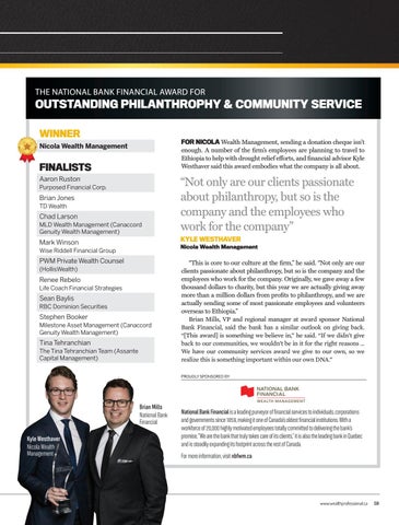 “This is core to our culture at the firm,” he said. “Not only are our clients passionate about philanthropy, but so is the company and the employees who work for the company. Originally, we gave away a few thousand dollars to charity, but this year we are actually giving away more than a million dollars from profits to philanthropy, and we are actually sending some of most passionate employees and volunteers overseas to Ethiopia.” Brian Mills, VP and regional manager at award sponsor National Bank Financial, said the bank has a similar outlook on giving back. “[This award] is something we believe in,” he said. “If we didn’t give back to our communities, we wouldn’t be in it for the right reasons ... We have our community services award we give to our own, so we realize this is something important within our own DNA.” PROUDLY SPONSORED BY