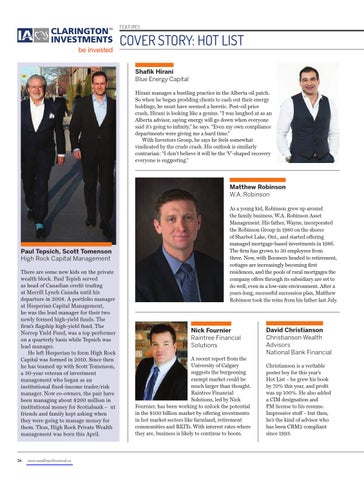 David Christianson Christianson Wealth Advisors National Bank Financial Christianson is a veritable poster boy for this year’s Hot List – he grew his book by 70% this year, and profit was up 100%. He also added a CIM designation and PM license to his resume. Impressive stuff – but then, he’s the kind of advisor who has been CRM2 compliant since 1993.