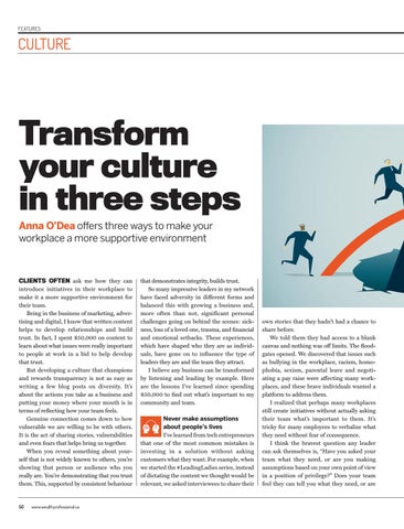 own stories that they hadn’t had a chance to share before. We told them they had access to a blank canvas and nothing was off limits. The floodgates opened. We discovered that issues such as bullying in the workplace, racism, homophobia, sexism, parental leave and negotiating a pay raise were affecting many workplaces, and these brave individuals wanted a platform to address them. I realized that perhaps many workplaces still create initiatives without actually asking their team what’s important to them. It’s tricky for many employees to verbalize what they need without fear of consequence. I think the bravest question any leader can ask themselves is, “Have you asked your team what they need, or are you making assumptions based on your own point of view in a position of privilege?” Does your team feel they can tell you what they need, or are