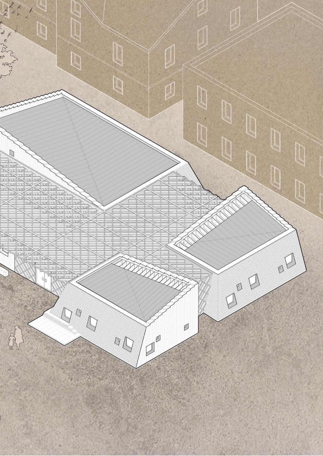 Using timber lattice, construct the ‘third’ space comprised of the lattice roof and storage walls.