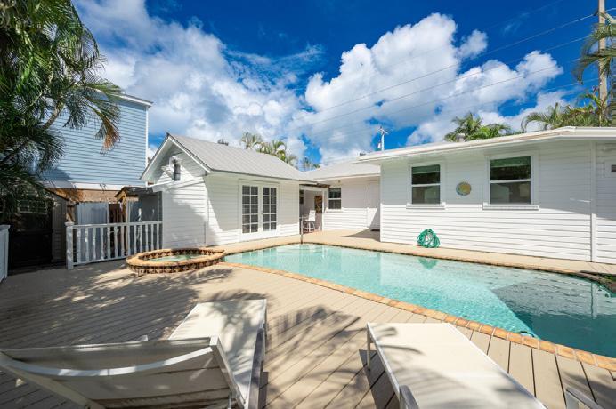 Your Tropical Oasis awaits! Here is a fantastic opportunity to own an elevated home with a private pool in one of the most coveted family neighborhoods on the island. As you make your way to the entrance you are welcomed by tropical landscaping and established orchids nestled on the palms. Once you enter the home, you will find an open concept kitchen and living room which is great for family time or entertaining. The kitchen is equipped with Viking appliances throughout and has a built in 100+ wine bottle cooler. Make your way out the double glass sliding doors to your fully fenced, private backyard oasis with travertine patio, covered sitting area and a perfect salt water plunge pool that is heated and chilled. This beautiful, well maintained home has two bedrooms and two bathrooms. The primary bedroom has a private porch and an ensuite bathroom with a large walk in shower. The secondary bathroom was fully remodeled this summer and has a tub with a shower. A new ondemand water heater was installed this month. This home is elevated, has impact windows and doors throughout and V Crimp metal roofing which will ensure low insurance costs. This property also has off street parking.