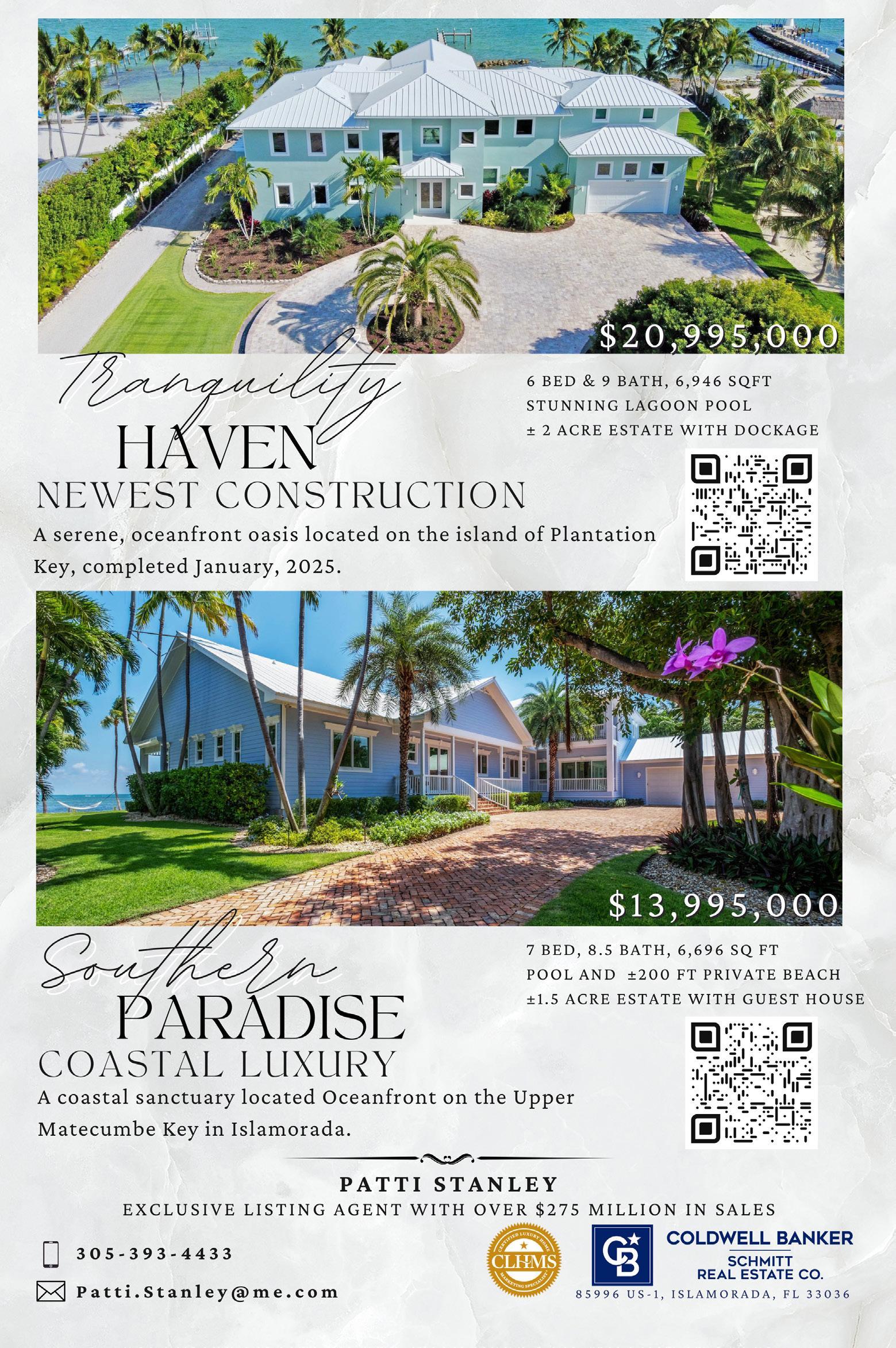 OPEN OCEAN in OLD TAVERNIER - 3/2 Concrete Pool Home with Dockage in the heart of historic Old Tavernier! Enjoy expansive ocean views, deep dockage, boat lift and stunning custom pool. Spacious great room with open kitchen and sprawling top floor primary suite. All concrete home with metal roof. Fenced yard, nearby community park and quick access to shopping, movies & more. $3,495,000 MLS:612896 Text RBKWSKT to 52187