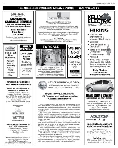 THE GUIDANCE/CARE CENTER, Inc. in KEY WEST is looking for: • Family Intervention Counselor • Behavioral Health Therapist • Care Coordinator • Driver Visit www.guidancecarecenter.org or careers.westcare.com to apply. EEOC/DFWP, Bilingual a plus; Drug & background screening required.