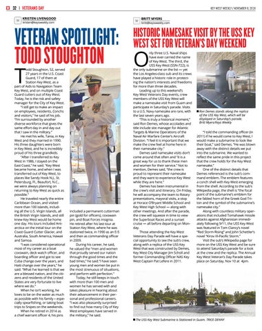 nly three U.S. Naval ships have ever carried the name of Key West. The third, the USS Key West (SSN-722), is the only submarine on the list — yet the Los Angeles-class sub and its crews have played a historic role in protecting the nation’s interests and freedoms for more than three decades. Leading up to this weekend’s Key West Veterans Day events, crew members of the USS Key West will make a namesake visit from Guam and participate in Saturday’s parade. Visits to a U.S. Navy namesake are rare, with the last seven years ago. “This is truly a historical moment,” said Ron Demes, whose accolades and title include site manager for Atlantic Targets & Marine Operations of the Naval Air Warfare Center’s Aircraft Division. “I feel it is important that we make the crew feel at home here in their namesake city.” Demes said namesake visits don’t come around that often and “it is a great way for us to thank these men and women for their service.” Not to mention, Demes said, “the crew is proud to represent their namesake and they want to experience Key West while they are here.” Demes has been instrumental in the crew’s visit and itinerary. On Friday, he will accompany the team to Rotary presentations, mayoral visits, a stop at Horace O’Bryant Middle School and Key West High School — along with other meetings. And after the parade, the crew will squeeze in time to view the Superboat Races and a sunset cruise — all before departing on Monday. Those attending the Key West Veterans Day Parade will have a special opportunity to see the sub’s crew, along with a replica of the USS Key West that was constructed by Demes, Key West City Manager Jim Scholl and former Commanding Officer NAS Key West Captain Pat Lefere in 2011.