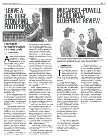 he Florida Keys’ representative in the U.S. House is lending her support and encouragement to the Florida Keys National Marine Sanctuary’s newly-released Restoration Blueprint. On Aug. 20, Rep. Debbie Mucarsel-Powell stopped by the sanctuary’s advisory council meeting in Marathon. Murcasel-Powell said she’s “encouraged” upon her first read of the plan due to its breadth and depth of coverage. The Restoration Blueprint contains four alternatives for change with proposed updates to the sanctuary boundary, regulations and marine zones. It synthesizes lessons from more than 20 years of experience in science, management, education and local community involvement. The congresswoman implored everyone in the room to remain engaged with the review process because the focus of the plan — the marine environment in the Keys — is of the utmost importance. “We have the third-largest barrier reef in the world and the only coral reef in the contiguous United States,” she said. “But we also have seagrasses, mangroves, fisheries and so many other important marine resources.”