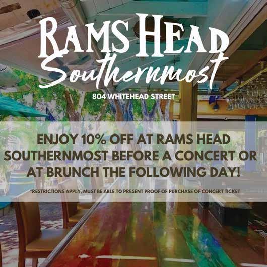 KEY WEST WEEKLY / AUGUST 10, 2023 48 UPCOMING EVENTS THEKEYWESTAMP.COM GRAHAM NASH KEY WEST THEATER NOVEMBER 4 & 5TH 1964 THE TRIBUTE KEY WEST THEATER SEPTEMBER 10TH TREY KENNEDY KEY WEST THEATER OCTOBER 12TH REVEREND PEYTON'S BIG DAMN BAND KEY WEST THEATER JANUARY 20TH 2024 THE MAN IN BLACK A TRIBUTE TO JOHNNY CASH KEY WEST THEATER FEBRUARY 11TH 2024 COLIN QUINN KEY WEST THEATER DECEMBER 7TH DIRTY HEADS COFFEE BUTLER AMPHITHEATER AUGUST 9TH ENJOY 10% OFF AT RAMS HEAD SOUTHERNMOST BEFORE A CONCERT OR AT BRUNCH THE FOLLOWING DAY! *MUST PRESENT PROOF OF PURCHASE OF CONCERT TICKET.