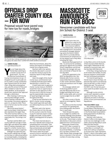 to Key West; and is on the boards of Fair Insurance Rates Monroe, which fights Tallahassee for fair windstorm insurance rates, and the Key West AIDS Memorial. In the Keys, rising property taxes hit renters the hardest, he said, because long-term rental properties lack homestead exemptions. “I’m tired of watching my friends have to leave the Keys, not because they want to, but because they are left with no other choice,” Massicotte said. “The actions of the BOCC over the last two years have made the problem worse, not better.” Although county commissioners each represent a certain segment of the Keys, they are elected by all voters in the Keys. All five current commissioners are Republicans. Two more BOCC races Also seeking reelection is County Mayor Holly Raschein, a Republican who served eight years in the Florida State House before being appointed to the BOCC by Gov. Ron DeSantis. Raschein, who holds the District 5 office in the Upper Keys, so far has one challenger on the ballot: perennial Republican candidate Jose Felix Peixoto. Commissioner Craig Cates, of Key West, is running for another term without competition as of press time. Cates represents District 1, which is the eastern part of Key West, Stock Island and Key Haven.