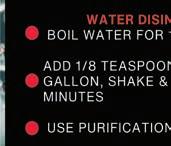 If a notice is issued, disinfect your water by either boiling for one minute, adding one-eighth teaspoon of bleach per gallon or using purification tablets (purchase at outdoor retailers). Alerts will be issued to keep you informed.