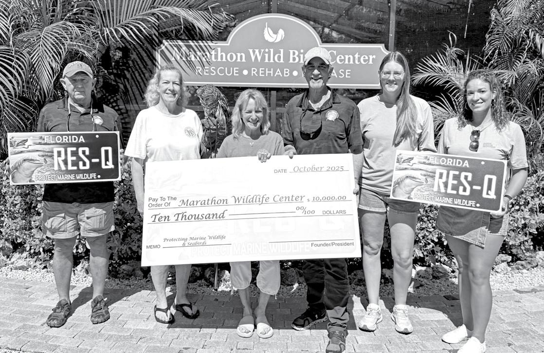 Animal rescue and rehabilitation organizations around the Keys are seeing their helping hands repaid, thanks to grants supplied by Florida’s Protect Marine Wildlife license plate. Created by the Protect Wild Dolphins Alliance, the specialty plate in Florida, Louisiana and South Carolina uses money raised from vehicle registrations to directly support activities that contribute to the conservation and protection of marine mammals and other marine wildlife species. Since August 2023, the alliance has awarded more than $275,000 in grants. On Oct. 24, representatives from the alliance made a visit to the Marathon Wild Bird Center to present the latest in a string of donations: a $10,000 check to support the activities of founder Kelly Grinter’s team. Grant monies will fund an additional staff member to care for non-releasable ambassador animals, along with support for the center’s general operating fund, Grinter told the Weekly. Pictured, from left: alliance executive officer Dr. Brian Joseph, Wild Bird Center board member Wendy Gates, Grinter, alliance founder Steve McCulloch, and Dolphins Plus Marine Mammal Responder’s Nicole Sears and Brieanna Wagler. ALEX RICKERT/Keys Weekly