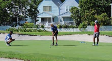 Emmett Merryman lines up his putt while fellow Dolphin Roco Piscetello, left, and Key West’s Geo Twyman look on. CONTRIBUTED
