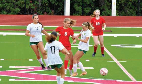 1. Key West’s Kenli Rosado (6) and Coral Shores’ Lela Goodrich (12) battle for possession while Sammy Bates (17), Bayley Catarineau (14) and Lily Baxter (19) look on.