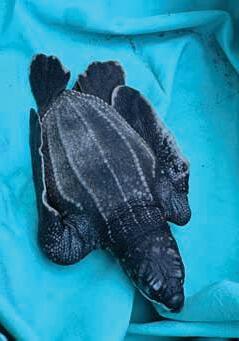 Cleared for release by Turtle Hospital staff, leatherback turtle hatchling Sailor awaits the journey home.