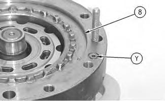 8. Place a shop towel over brake piston (8) . Retain brake piston (8) with Tooling (B) . Apply approximately 525 kPa (75 psi) of shop air pressure to brake release Port (Y) . Make sure that the shop air pressure is free of water. Brake piston (8) will move up the piston guide, and out of the piston guide. Remove brake piston (8) from the body of the travel motor.