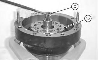 12. Install Tooling (C) into shaft (15) . Use a prybar to remove the rotating assembly (16) from the housing.