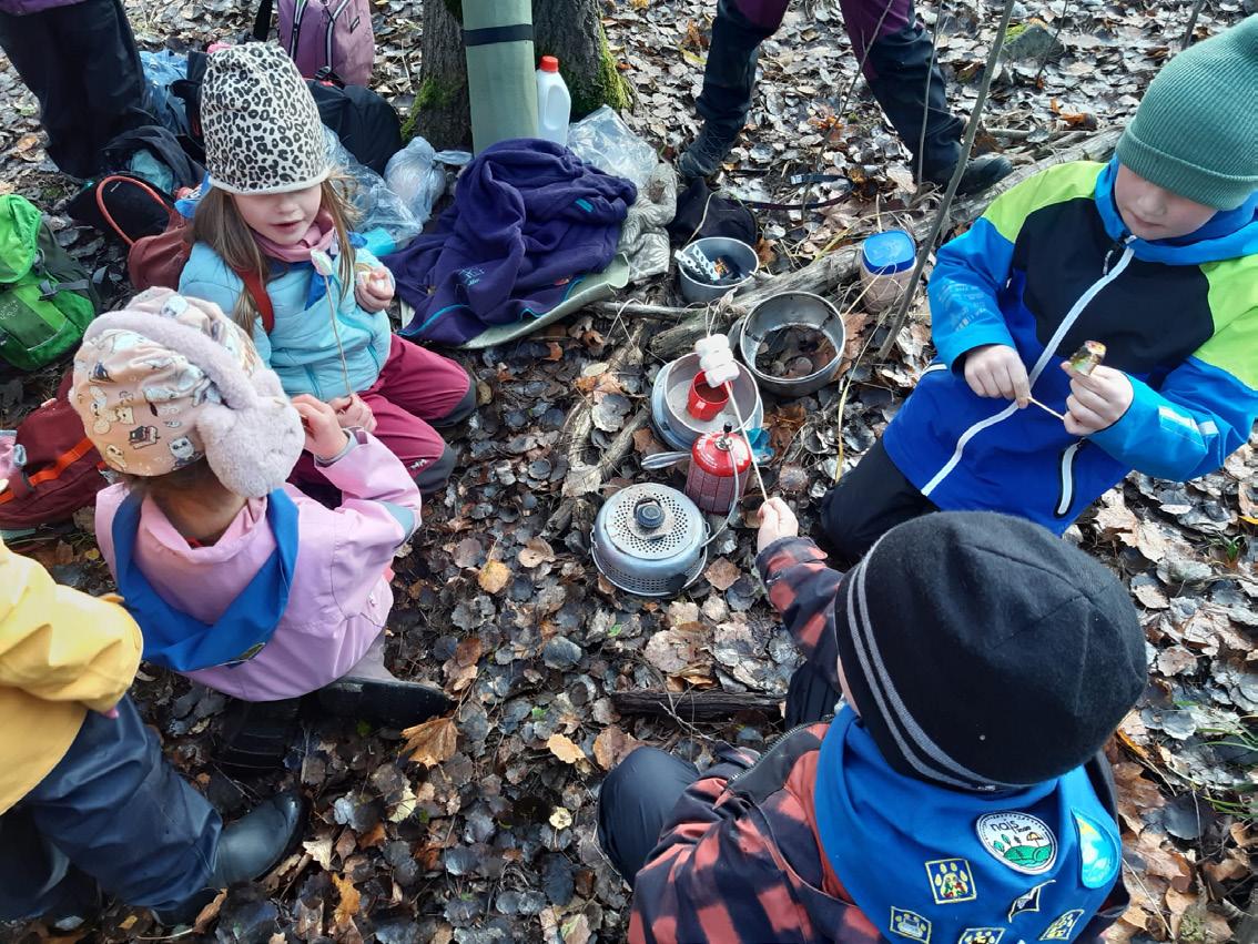 Under hösten har vi varit både ute och inne. Vi har sökt geocachar och orienterat. I november vandrade vi till grillplatsen vid Rutiån och övade att göra upp eld. När elden sedan falnade grillade vi korv och till det fick vi varm glögg. Mums!