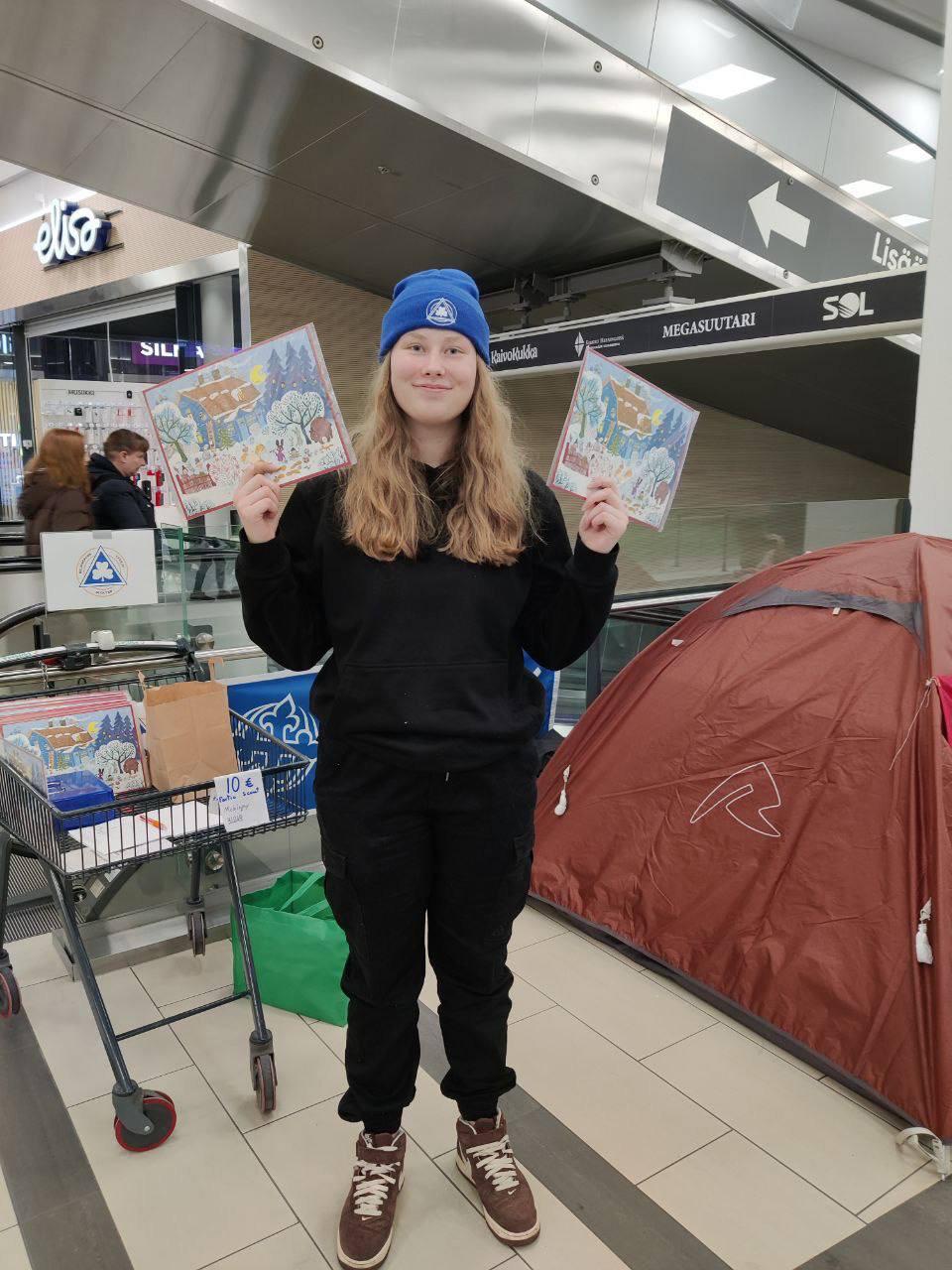 Bild: Kate LönnbergDen 11 och 12 November var vi i vanlig ordning i Kaari och sålde adventskalendrar. Detta året fick vi en annan plats än var vi vanligtvis brukar stå men den nya platsen var riktigt bra ändå. Tidigare år har vi även sålt i 24 timmar i sträck men vi valde att detta året istället sälja ca 8 timmar båda dagarna. Vargungarna och äventyrsscouterna var båda dagarna på plats och sålde duktigt. Spejare och äldre fick komma och sälja när de ville. Säljande gick i år igen mycket bra och fast vi var på plats mycket färre timmar så sålde vi ungefär lika mycket som tidigare år.