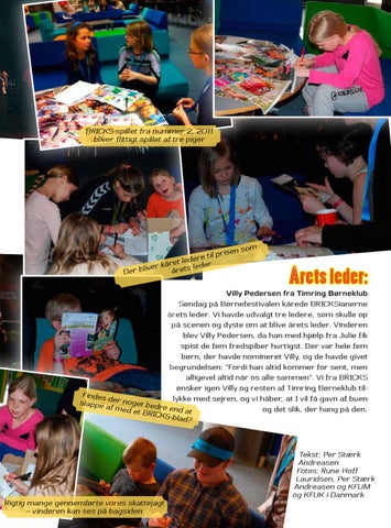 Villy Pedersen fra Timring Børneklub Søndag på Børnefestivalen kårede BRICKSianerne årets leder. Vi havde udvalgt tre ledere, som skulle op på scenen og dyste om at blive årets leder. Vinderen blev Villy Pedersen, da han med hjælp fra Julie fik spist de fem fredspiber hurtigst. Der var hele fem børn, der havde nomineret Villy, og de havde givet begrundelsen: ”Fordi han altid kommer for sent, men alligevel altid når os alle sammen”. Vi fra BRICKS ønsker igen Villy og resten af Timring Børneklub tilFindes lykke med sejren, og vi håber, at I vil få gavn af buen d slappe er noget bed af med r e e nd og det slik, der hang på den. a et BRIC KS -bla t d?