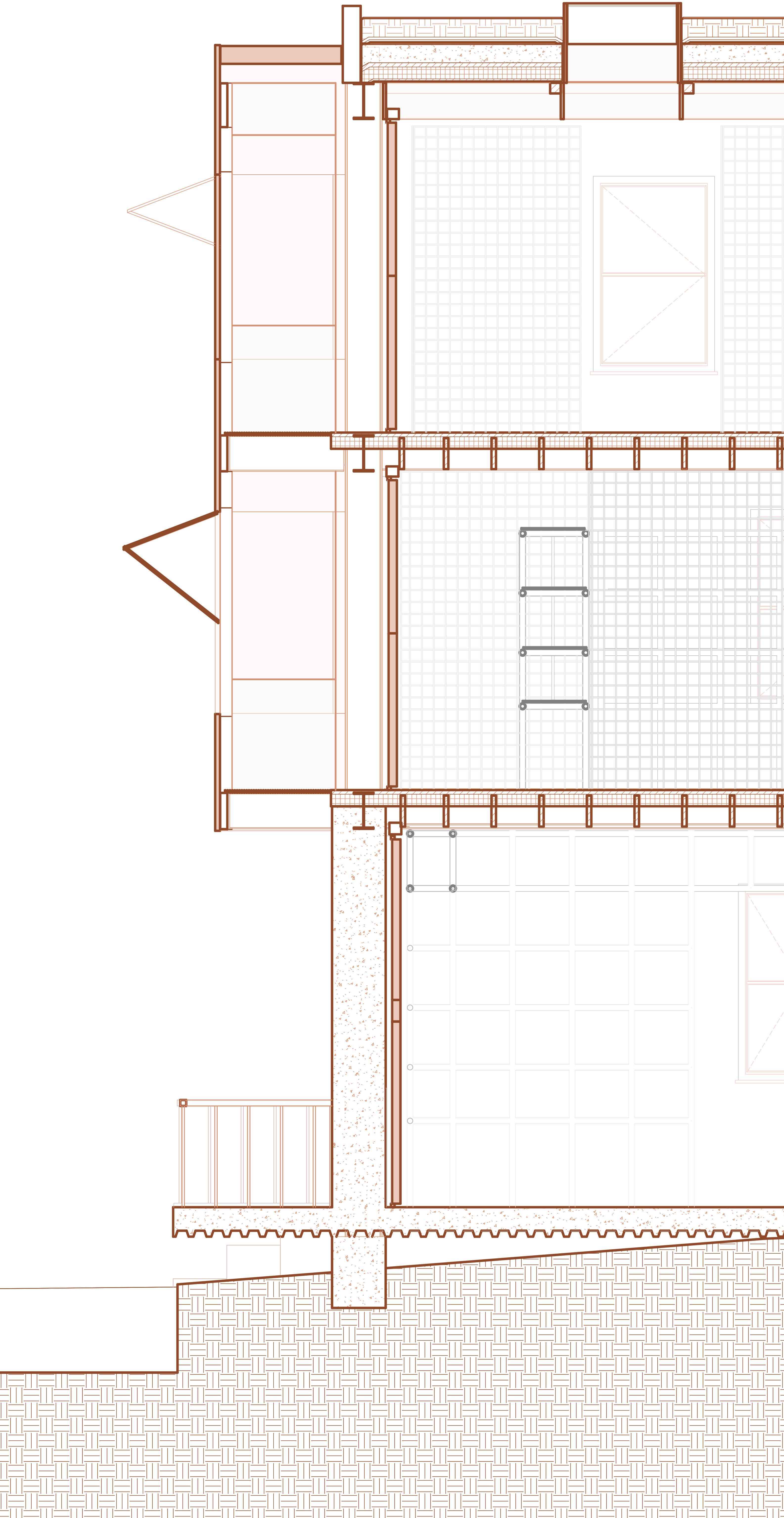 The existing Sutherland house shares a wall with Sutherland building’s west wing. It is a domestic space surrounded with vacant outdoor spaces, and it is situated next to the contemporary studio extension. My proposal recognises the existing layers of architectural language and aims to communicate and contribute to the clusters of high brick walls through presevation of the existing and insertion of the proposed. This is done by preserving the north wall to be used for shelving, circulation experience, and most importantly, as a structural guide. On the other hand, the south facade is carefully cut and displaced to make room for a new space that connects inside and outside, old and new, exhibition and community. Displacing the south facade, provides an open plan programme that can be adapted to different functions, whether it is a space for the exhibition or the community. The proposed circulation supports this by acting as a partition, creating two rooms in each floor. The proposed facade creates a visual contrast with its translucent materiality, but its function complements the existing buildings and the site. It creates inside-outside spaces that communicate with the studio extension, and enhances the existing biodiversity on site.