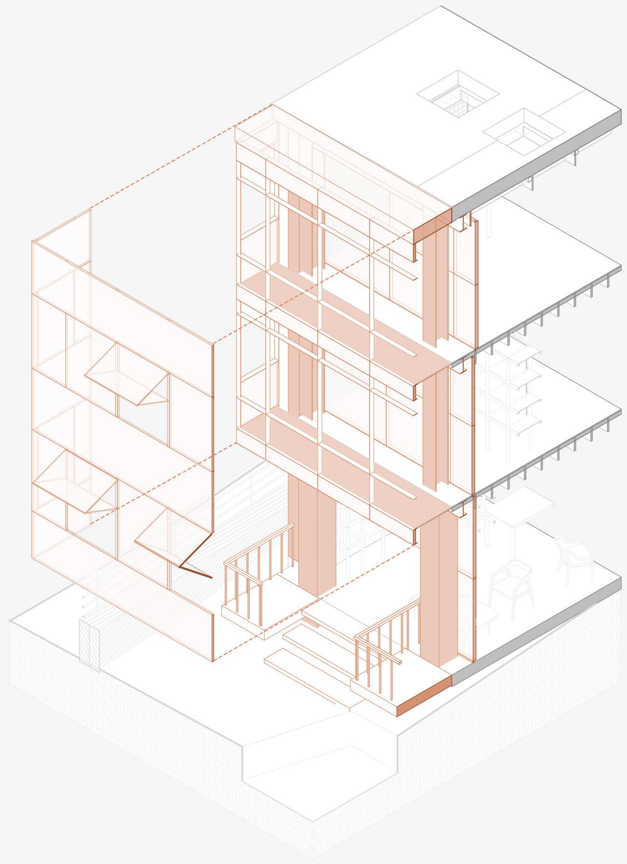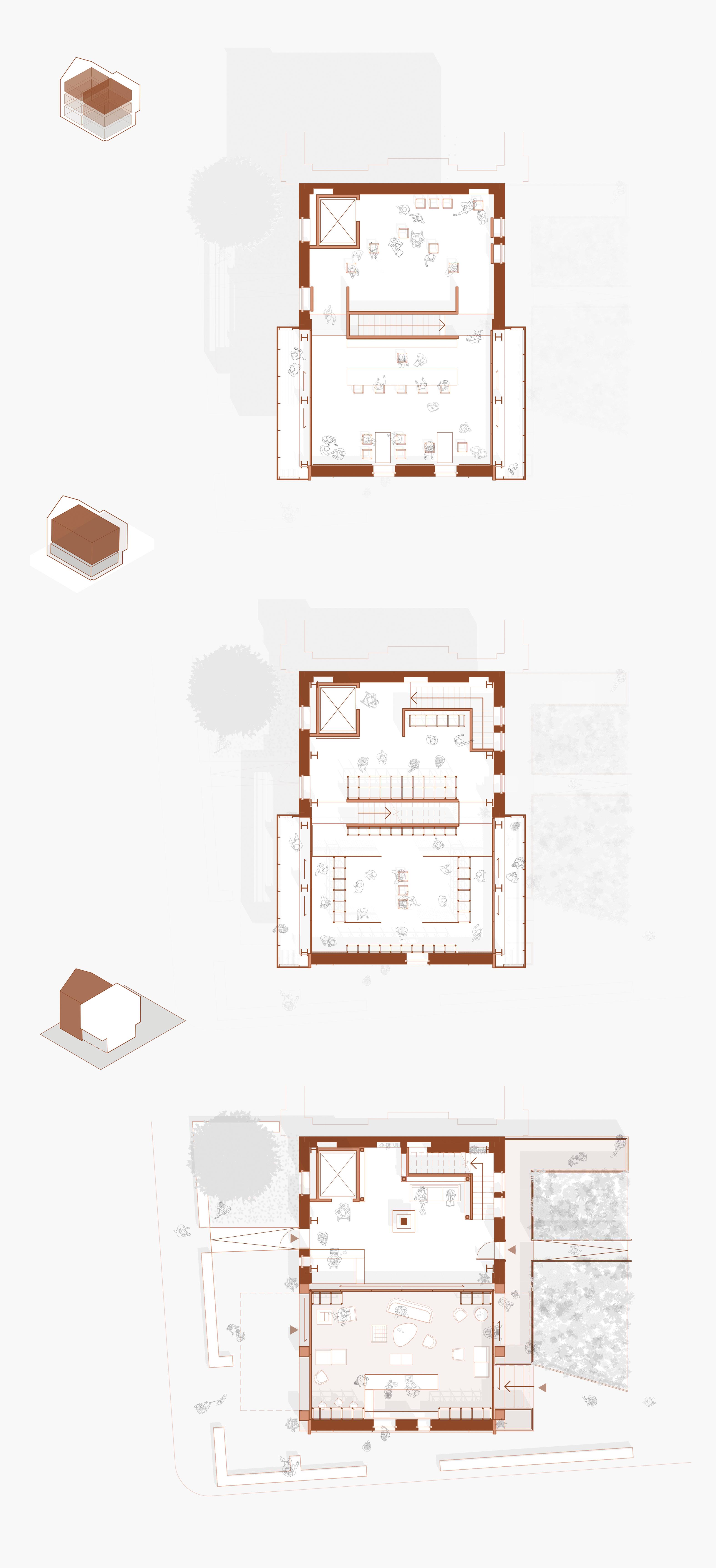 Similar to the facade, the programme follow’s an open plan design, with the ground floor serving as the spine that connects the site to its host building (east) and the public (west). This approach aims to accommodate a wide range of users and support the flexibility of the community space.