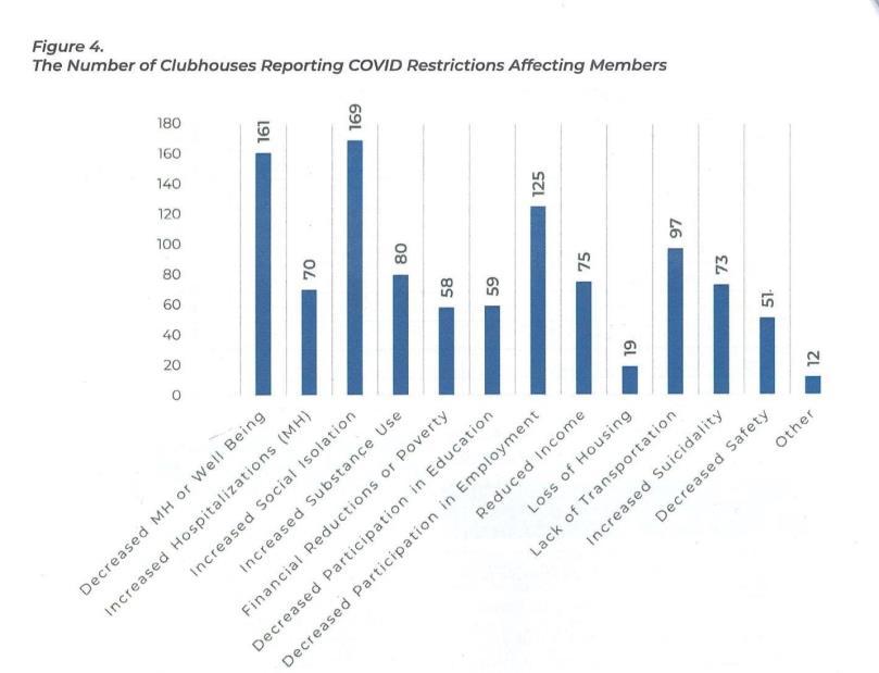 4. Fjarlægðartakmarkanir vegna faraldursins höfðu áhrif á félaga á ýmsum vettvangi, þar á meðal aukna einangrun, lakari heilsu og lífsgæði. Einnig jókst notkun vímugjafa, sjálfsvíg og sjúkrahúsinnlagnir. Félagar misstu úr námi og vinnu, sérstaklega ráðningu til reynslu. Einnig varð þjónusta almenningssamgangna verri.