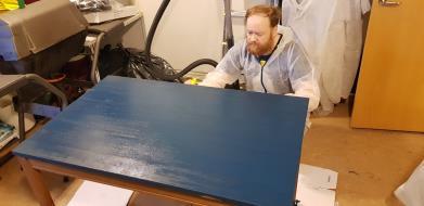 Vel skal vanda sem lengi skal standa segir á góðum stað. Nú er verið að mála og leggja síðustu hönd á hlaðvarpsstúdíóið. Á myndini er Fannar að mála tækjaborðið og á efri myndinni er viðtalsborðið. Vonumst til að nú verði hafnar útsendingar á fullu á nýju ári. Þetta hefur verið þolinmæðisverk en að sama skapi árangursrík vinna og skemmtileg.