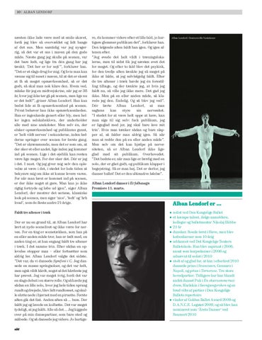 næsten ikke lade være med at smile akavet, fordi jeg blev så overvældet og lidt bange af det sus. Men samtidig var jeg nysgerrig, så det var et sus i maven på den gode måde. Næste gang jeg skulle på scenen, var det bare fedt, og lige fra dén gang har jeg tænkt; ’Det her er for sejt’”, forklarer han. ”Det er et slags drug for mig. Og hvis man kan vænne sig til suset i maven, til at det er skønt at få så meget opmærksomhed, så er det godt, så skal man nok klare den. Hvem ved, måske får jeg en midtvejskrise, når jeg er 35 år, hvor jeg ikke tør gå på scenen, men lige nu er det fedt!”, griner Alban Lendorf. Han kan bedst lide at få opmærksomhed på scenen. Privat behøver han ikke opmærksomheden. Han er ingenlunde genert eller bly, men heller ingen selskabsklovn, der underholder alle med sine anekdoter. Men selv én, der elsker opmærksomhed og publikums gunst, er ’helt vildt nervøs’ i sekunderne, inden fødderne springer over scenen for første gang. ”Det er skræmmende, men det er som om, at der sker et eller andet, lige inden jeg kommer ind på scenen. Lige i det øjeblik kan resten være lige meget. For der sker det. Dér er jeg i det. I nuet. Og jeg giver mig selv den oplevelse at være i det, i stedet for hele tiden at bekymre mig om ikke at kunne levere varen. For når man først er kommet ind på scenen, er der ikke noget at gøre. Man kan jo ikke rigtig fortryde og løbe ud igen”, siger Alban Lendorf, der mestrer det seriøse, klassiske look på scenen, men siger 'nice', 'fedt' og 'årh hvad', som de fleste andre 21-årige. Faldt tre aftener i træk Der er nu en grund til, at Alban Lendorf har lært at nyde scenelivet og ikke være for nervøs. For en ting er scenetækken, som han på en eller anden måde tror, han er født med, en anden ting er, at han engang faldt tre aftener i træk. I det samme trin. Efter sådan en oplevelse stopper man – eller fortsætter som aldrig før. Alban Lendorf valgte det sidste. ”Det var, da vi dansede Symfoni i C. Jeg dansede en masse springsoloer, og det var fedt, men også vildt hårdt, noget af det hårdeste jeg har prøvet. Jeg var meget ivrig, fordi det var en slags debut i en større rolle. Og så havde jeg sådan en lille solo, hvor jeg hele tiden sprang rundt og drejede, blev lidt rundtosset, og skulle slutte nede i hjørnet med en piruette. Første aften gik det fint. Anden aften så … bum. Der faldt jeg og lavede en kolbøtte. Det var meget tydeligt, at jeg faldt. Alle så det … Jeg kiggede over på min dansepartner, som bare stod og måbede. Og så dansede jeg videre. Jo hurtige-