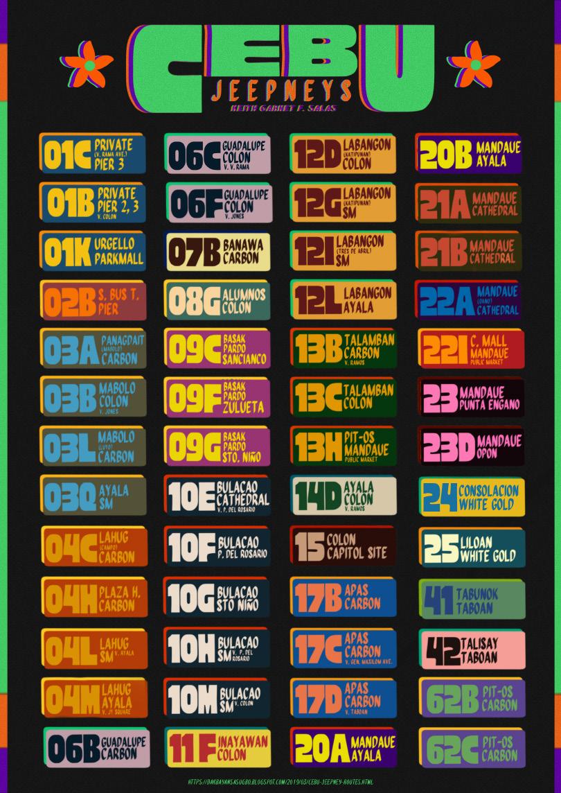 This Infographics Design project for Cebu Jeepney Routes creates a visually appealing, symmetrical infographic detailing the coding system of Cebu's jeepney routes. It uses icons, color codes, and clear typography to represent route numbers and destinations, resulting in an informative and easy-to-understand infographic.