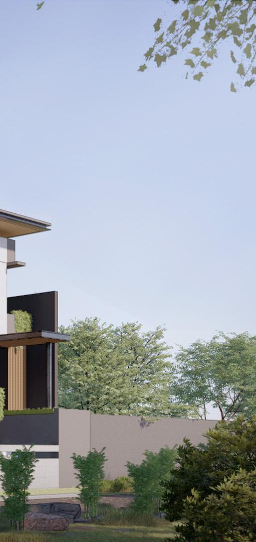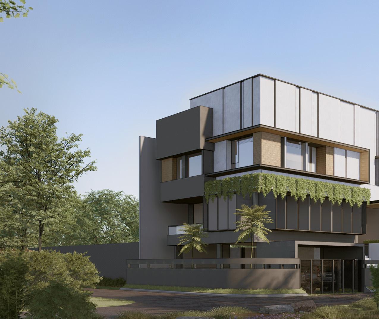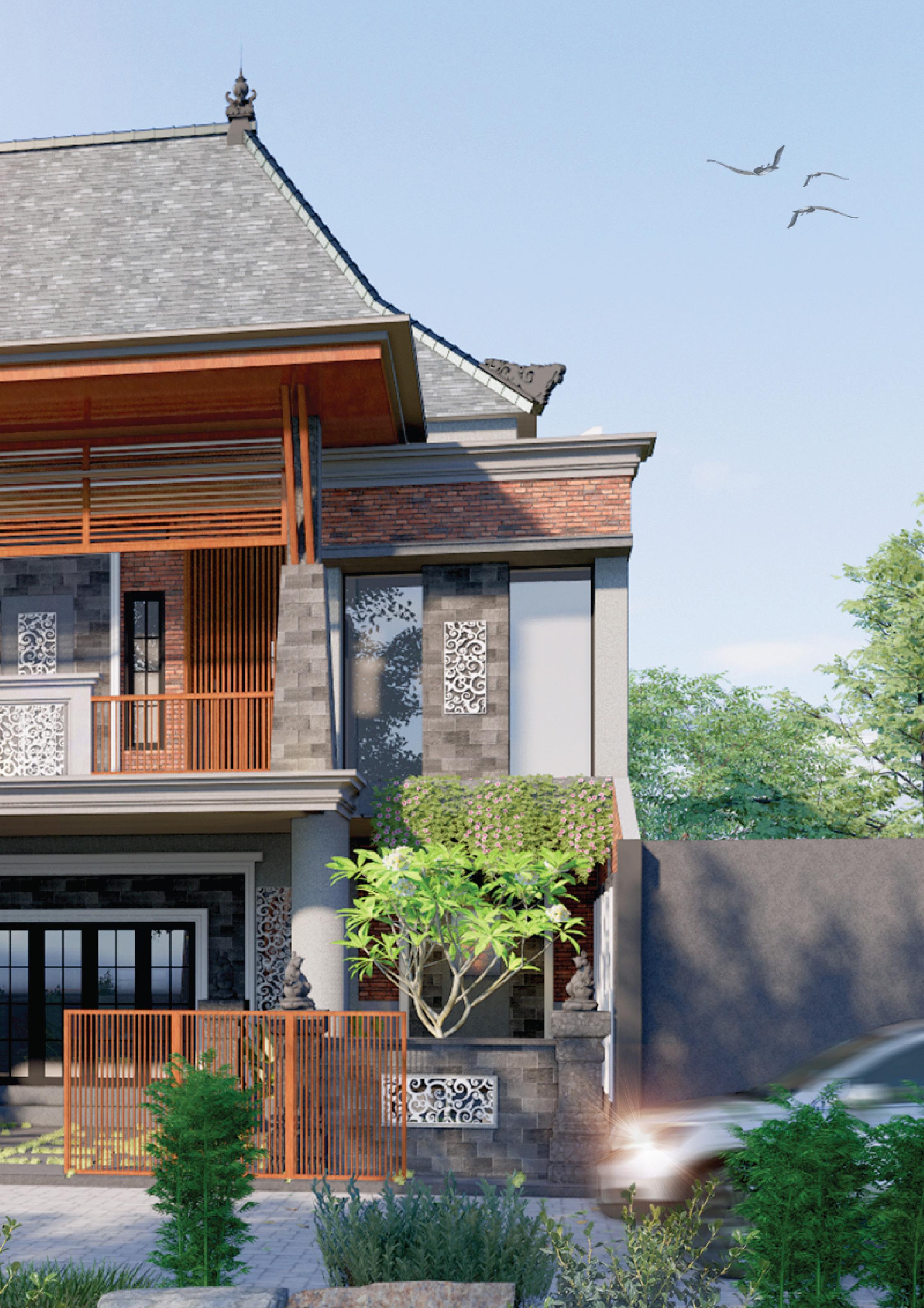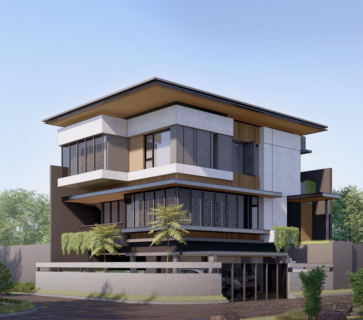 Lokasi rumah berada di kawasan perumahan dan berada pada lahan hook sehingga rumah memiliki 2 fasad pada sisi depan dan samping. Proposal desain rumah ini memliki 2 alternatif desain fasad dengan konsep tropis modern dan box mass dengan menggunakan 3 tone warna yaitu hitam, putih dan cokelat yang sehingga memberikan kesan hangat.