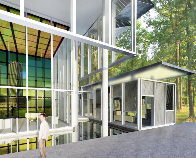 The Office and The Hotel Suites adopt the principles of view sharing through the building form A semi-transparent undulating canopy is set to float above the low-rise office suites to allow similar unobstructed views into ‘The Forest’ while providing sufficient weather protection The presence of greenery is maximized through a succession of cascading gardens and landscaped terraces.