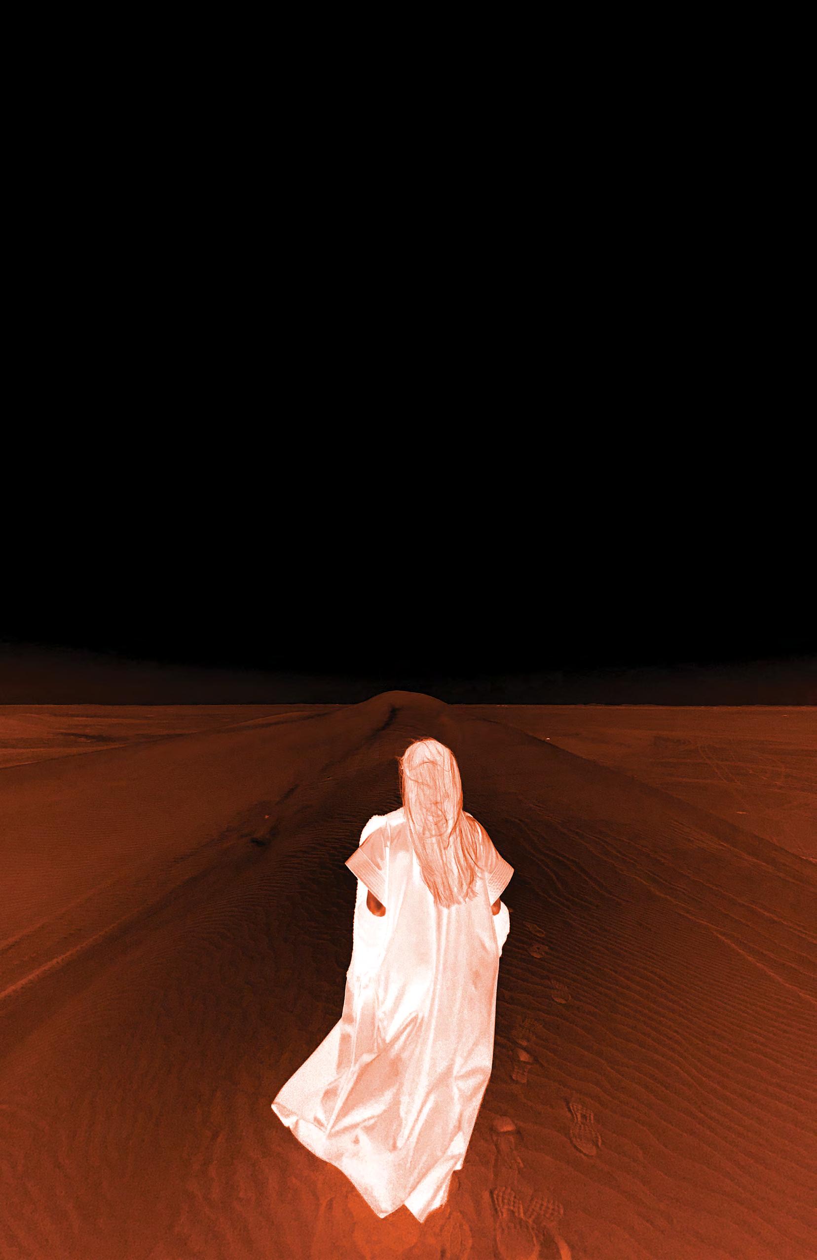 One grain of sand in a desert is a skeuomorphism of one body in the cosmos. A loud and crippling thought. A calm and comforting feeling, the vast nothingness of Arabia.