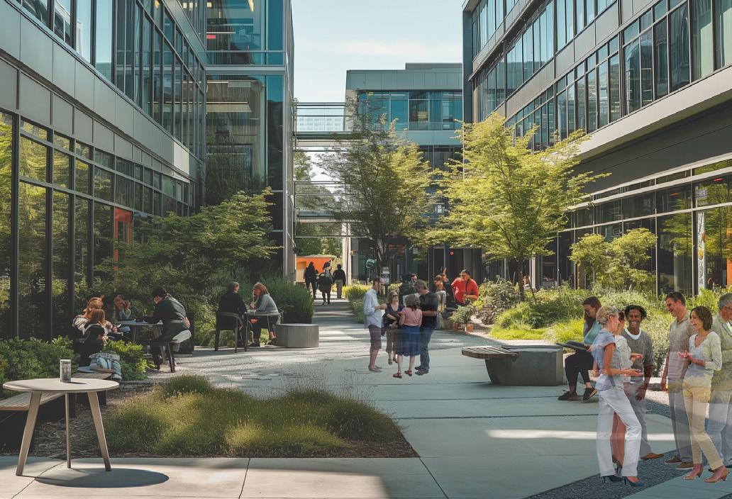 A cultural plaza with heavy adaptive reuse of warehouses and factories. Lush greenery, event spaces, commercial buildings, and restaurants surround the museum that acts as an anchor.