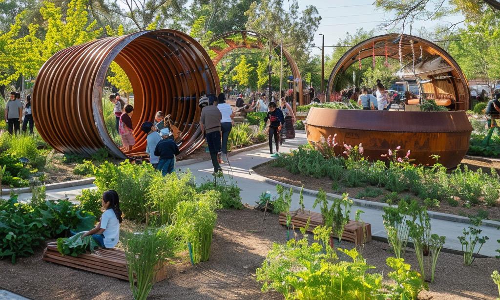 A park with a community center, WIC center, artists lofts, art exhibits, and restaurants for the community. Old underground storage tanks are now used as sculptures and park fixtures.