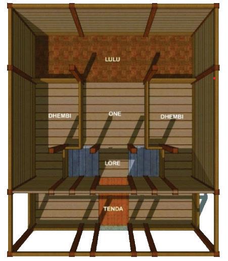 The largest area is the stage and entertainment area, which is located in the middle. So, the other rooms can access the stage and entertainment directly. It was a gathering place for visitors, similar to “One” from the Sa’o traditional house, which was a family gathering place. The lavatory and utility room are located at the back, like “Lulu” which is used as a men’s room and storage. Then the restaurant is located on the right side, like Dhembi where the cooking area is located.