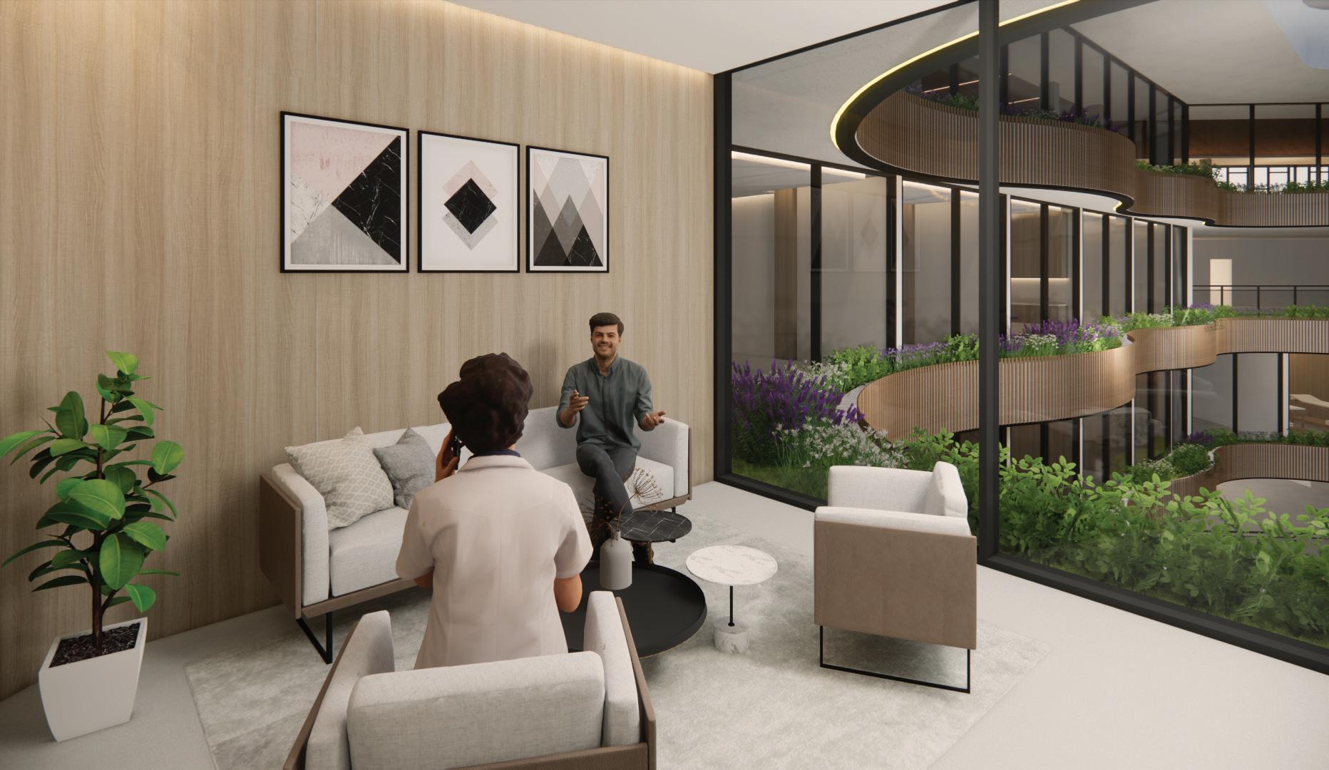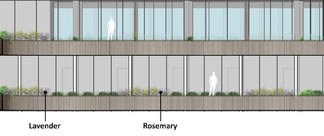 The building features a planter box in its central area, enhancing the greenery view within the building. Within this area, there are aromatherapy plants such as Lavender and Rosemary. These plants offer various benefits in holistic health centers. Lavender is known for its calming and stress reduction effects. On the other hand, rosemary aids memory and concentration, while also positively impacting mood. Their presence creates an environment conducive to relaxation and healing, making them valuable elements in holistic therapy.