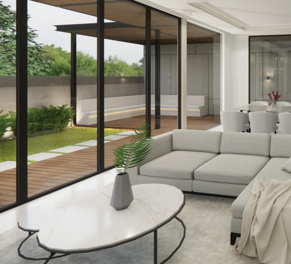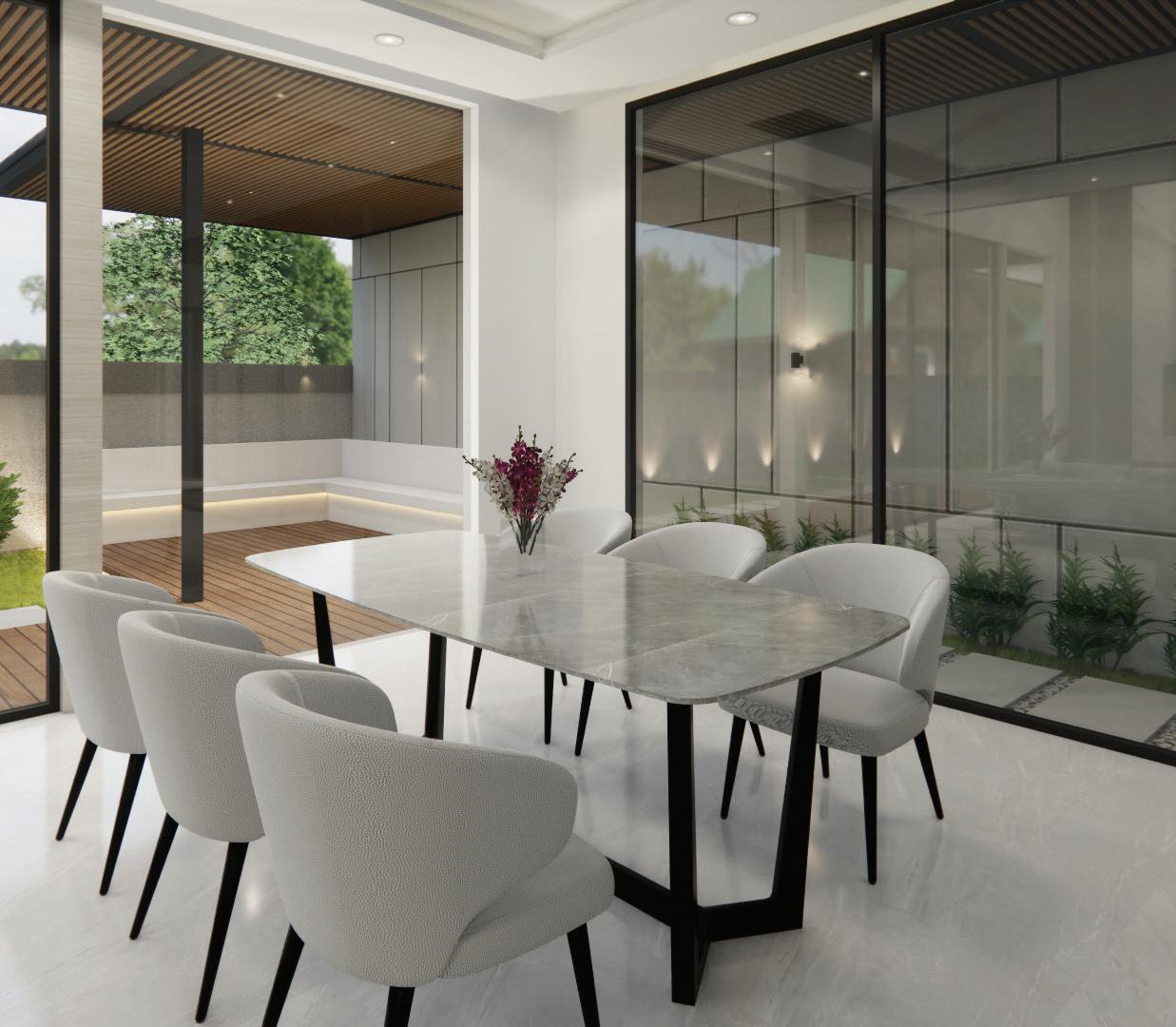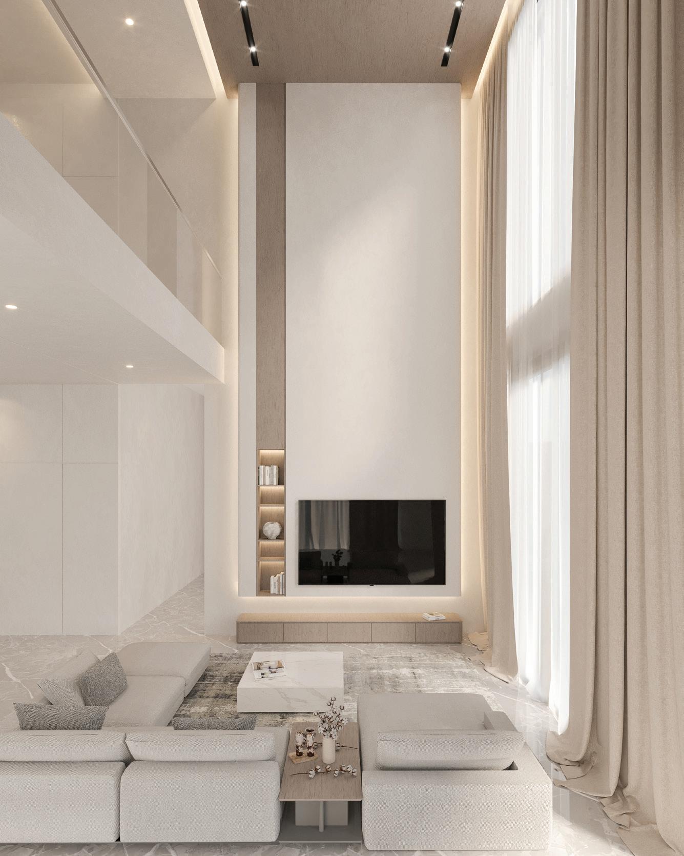 The main feature of the house is the living room with a modern, open-concept space with high ceilings. The focal point is a white marble TV backdrop that stretches to the ceiling, flanked by dark wood shelving. Circular chandeliers hang above, complementing the floorto-ceiling windows offering views of greenery. The neutral color palette and plush textures create a serene yet sleek atmosphere.