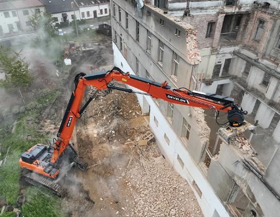 The demolition of the former Tesla industrial site in Lanškroun, Czech Republic, is currently underway as part of redevelopment plans for a new radio frequency chip production plant. Czech contractor BISA Spol is using a Develon DX380DM-7 demolition excavator to dismantle the four-storey structure’s external walls and chimneys. ■