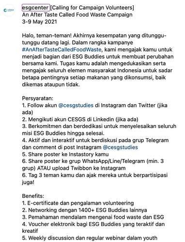 objective:Recru t campa gn vo unteers for ESG (Environmental, Socia , and Governance) budd es to commemorate Earth Day from May 3rd to May 9th, 2021.