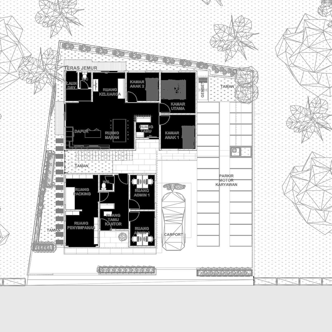 This building is a residential house adjoining a denture factory and workspace.With a family of 5 people. Their 3 young children have to live side by side with denture production activities. Separation of family privacy space, production space, and buying-selling activities is a challenge in making the design of this building.