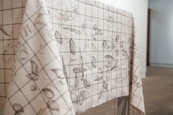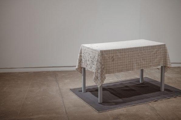 In this artwork, the fabric functions as a record of the recipe’s evolution across time. The table becomes an active surface that carries traces of those who sit around it. The work draws attention to the informal ways in which histories are recorded and communicated through everyday practices.