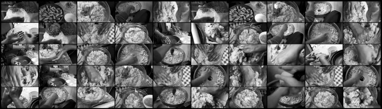 The Cookbook of Gestures is a multi-channel video installation composed of 150 video clips. The installation is organised into five “recipes.” Each small frame shows a single hand gesture related to preparing food. The videos focus on repetitive movements associated with cooking - folding, stirring, holding, grinding, and waiting. The work centres the hands and the rhythms of preparation rather than the finished dish.