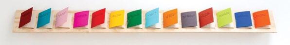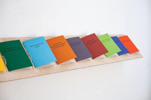 Presented here are fourteen hand-bound booklets, each in a different colour and bound together using twine. They are displayed as individual yet connected objects, meant to be handled and read. Each booklet contains an anthology of fragmented recipe-poems. By presenting these texts in the form of recipe booklets, the artist reimagines the traditional format of the cookbook.