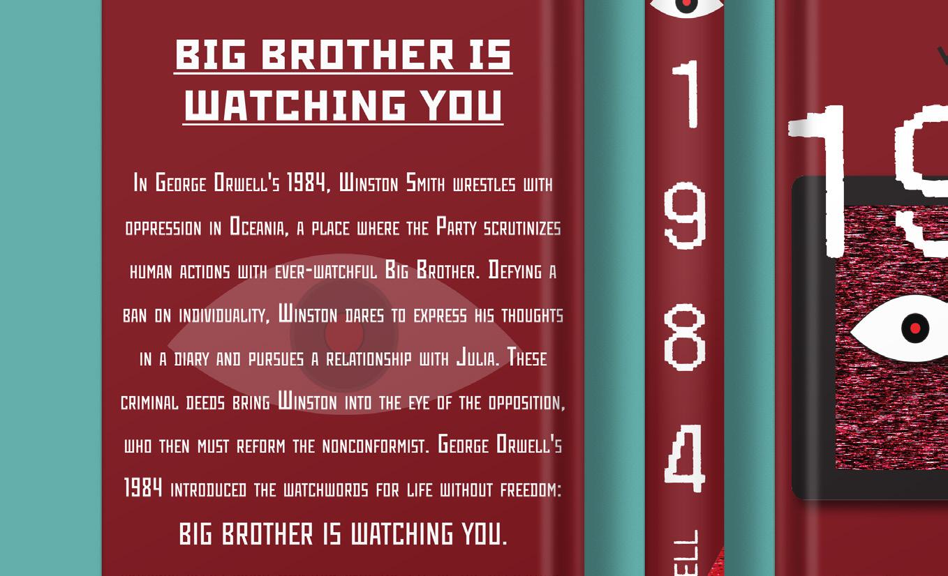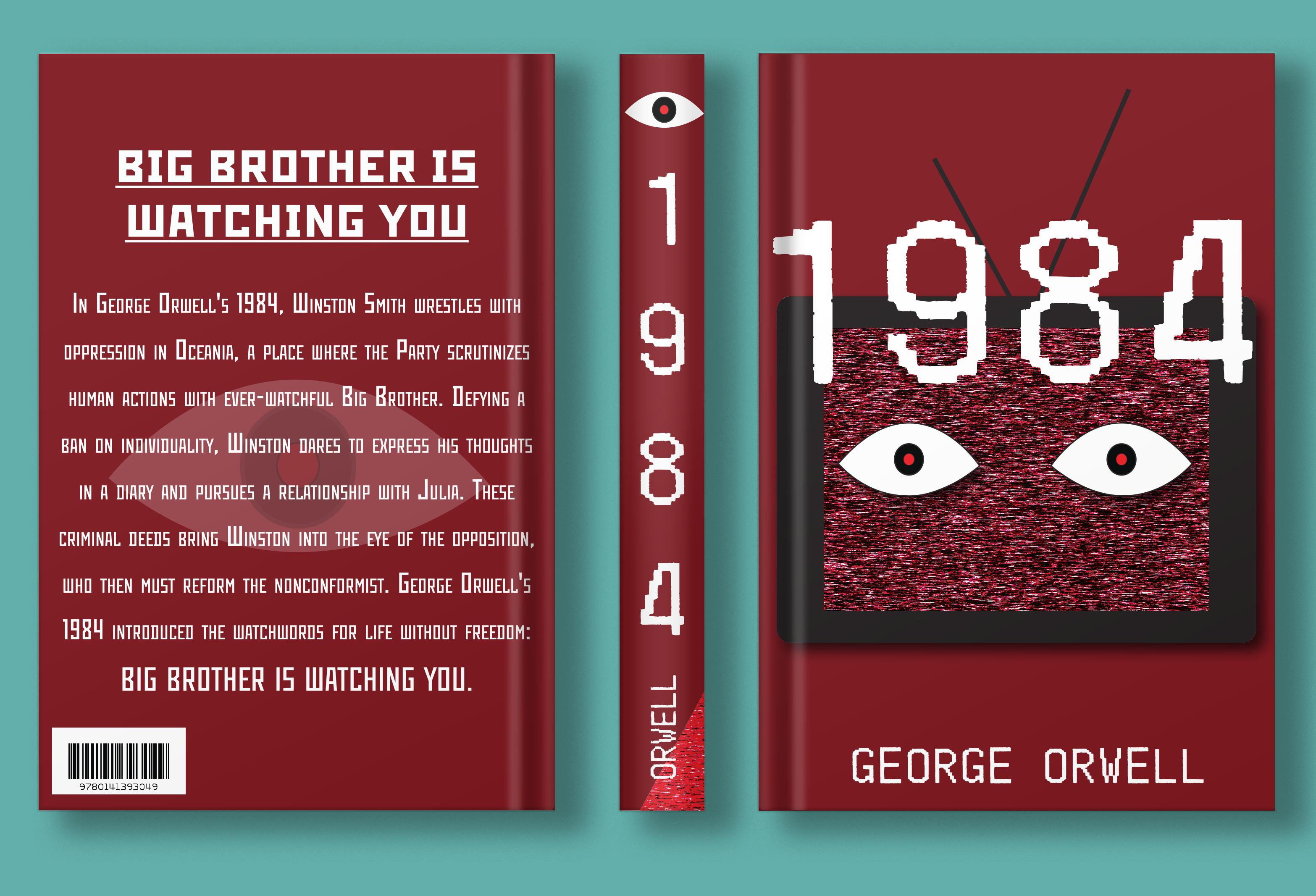 George Orwell’s dystopian novel “1984,” highlights repression and surveillance, incorporating elements of old technology and unsettling imagery. The front cover is designed to be jarring, mirroring the challenging themes of the novel, while the spine and back cover are more minimalist, focusing on conveying information. The inclusion of eyes throughout the design reinforces the concept of constant surveillance. Overall, the project showcases “1984” with elements of the modern analog horror genre that inspires me.