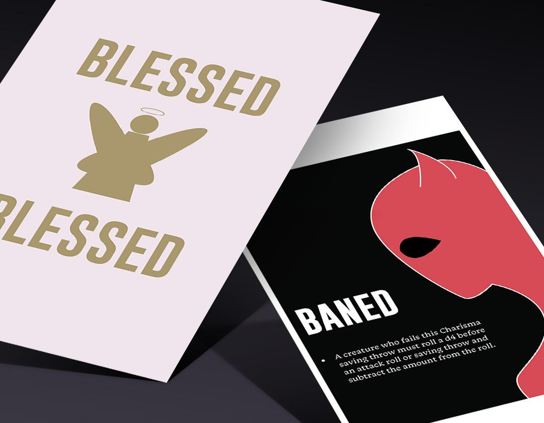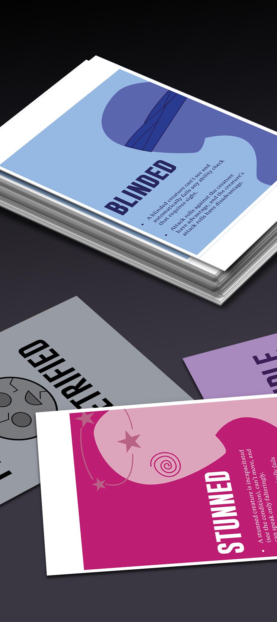 Vector - Layout - TypographyDungeons and Dragons has become a cherished hobby, leading me to design cards explaining various in-game status effects, such as poisoning or blindness, for my gaming group. Drawing from my passion and expertise in the game, I incorporated unique colors and symbols to distinguish each effect, ensuring practicality while maintaining visual appeal. Striving to infuse whimsy into typically mundane informational cards, I utilized bold colors and typefaces, merging my love for design with my enthusiasm for Dungeons and Dragons. This project not only showcases my design skills but also demonstrates the potential for creativity and usefulness when passions intersect with design endeavors.