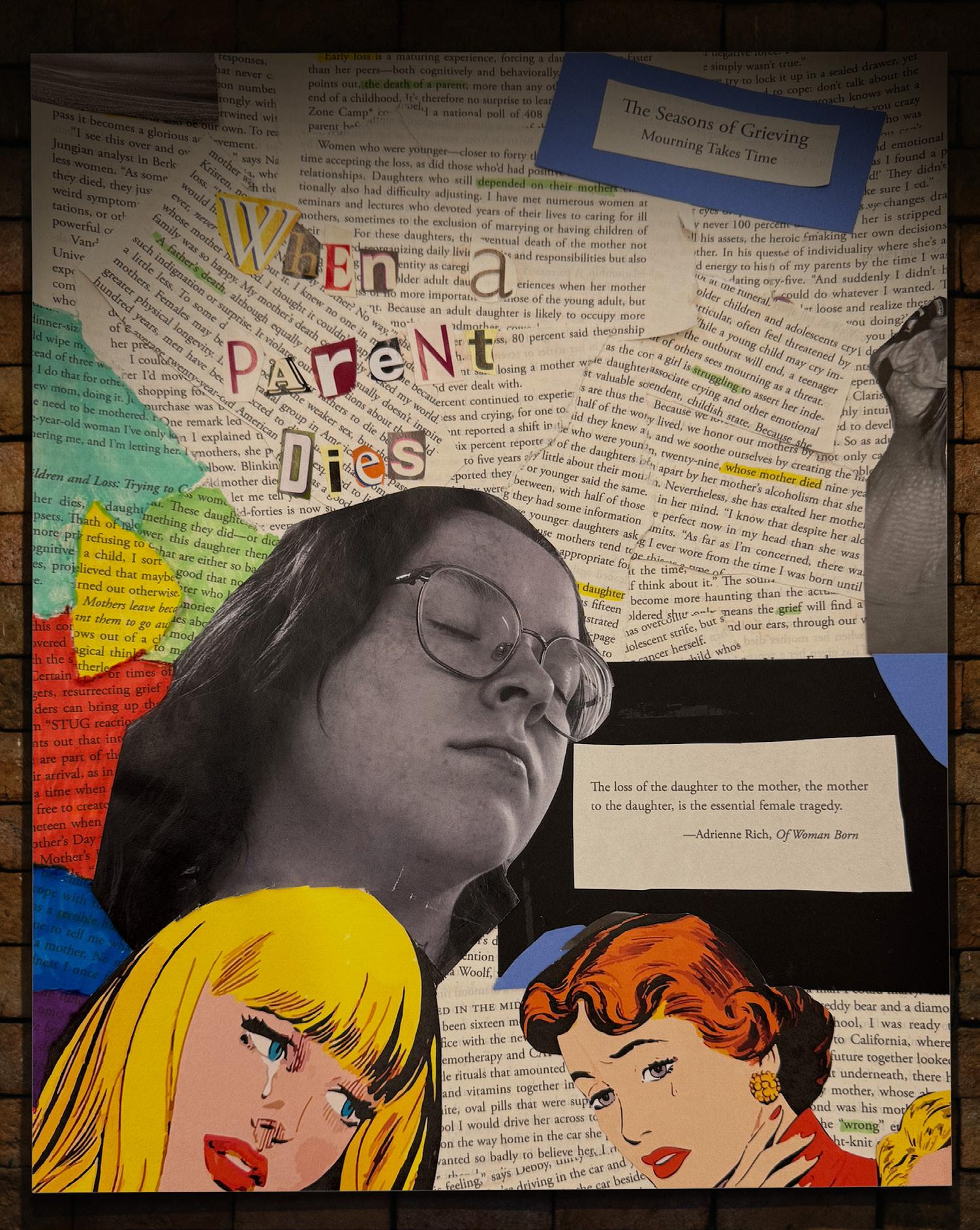 Experiencing profound grief after losing my mom at age eleven spurred me to find solace in art, eventually leading me to work in grief expressive arts. Transitioning this personal journey into my professional design portfolio, I sought to convey the complexities of grief through visual storytelling rather than words alone. Utilizing a repurposed book and relatable quotes, I crafted a piece that juxtaposed colorful imagery with black and white to reflect the internal turmoil of grief. This project encapsulated my growth from childhood art therapy to professional graphic design, illustrating the rewarding process of transforming tragedy into tangible expression.