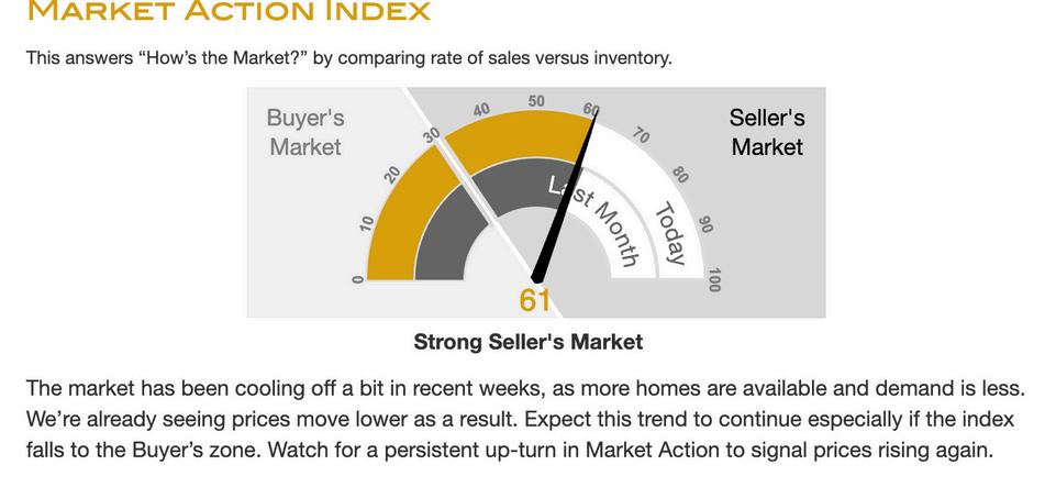 THIS WEEK THE MEDIAN LIST PRICE FOR DANVILLE, CA 94526 IS $2,099,000 WITH THE MARKET ACTION INDEX HOVERING AROUND 61. THIS IS LESS THAN LAST MONTH'S MARKET ACTION INDEX OF 63. INVENTORY HAS DECREASED TO 33.