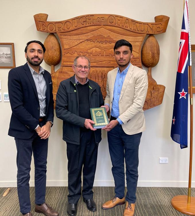 On the 13th of July, Murabbi Sabah-uz-Zafar Sahib and Rafay Basharat held a Coffee Cake & True Islam Session in Taumarunui, which was attented by members of the public and MP (member of parliament) of Rangitikei, Ian Mckelvie who is also an editor for the Taumarunui Bulletin, which is a local community paper. The two also drove down to Ohakune and met with the Mayor of Ruapehu District Council. They had an overwhelmingly deep discussion about various topics & in particular, Islam. It was an honour, says Murrabi Sahib, to have presented him the Holy Quran & the book of Huzur (aba), World Crisis and the Pathway to Peace, as a gift to him.