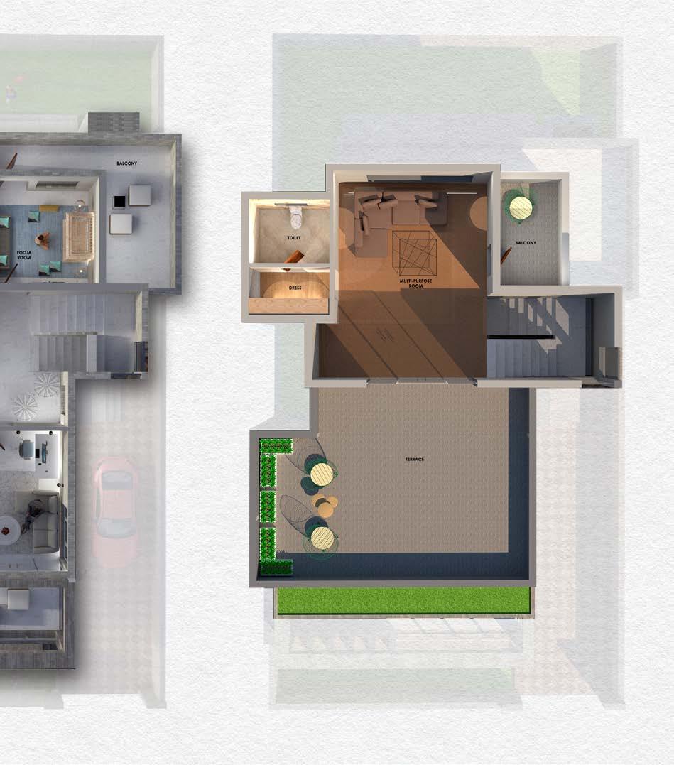 In addition to it, a common multi-purpose hall has been realized in the form of stilt parking at ground floor, which can accommodate 2 four-wheel vehicles and can be converted into a big party space.